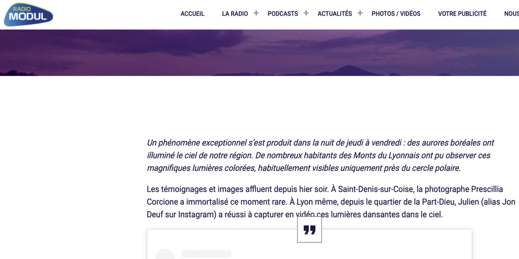 Au fil de mes projets, j’ai eu la chance d'être contacté par certains médias, parfois accompagné d'autres photographe de talents, qu’il s’agisse de mes clichés des paysages des Monts du Lyonnais, ou encore de mes photographies du ciel étoilé et des aurores boréales. Chaque parution est pour moi une reconnaissance précieuse et un moyen de partager ma passion avec un public encore plus large que ce soit dans la presse ou sur d'autres sites.